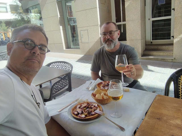 Nous déjeunons à l'heure espagnole : Pulpo à la Gallega, verre de vin blanc ou bière.
